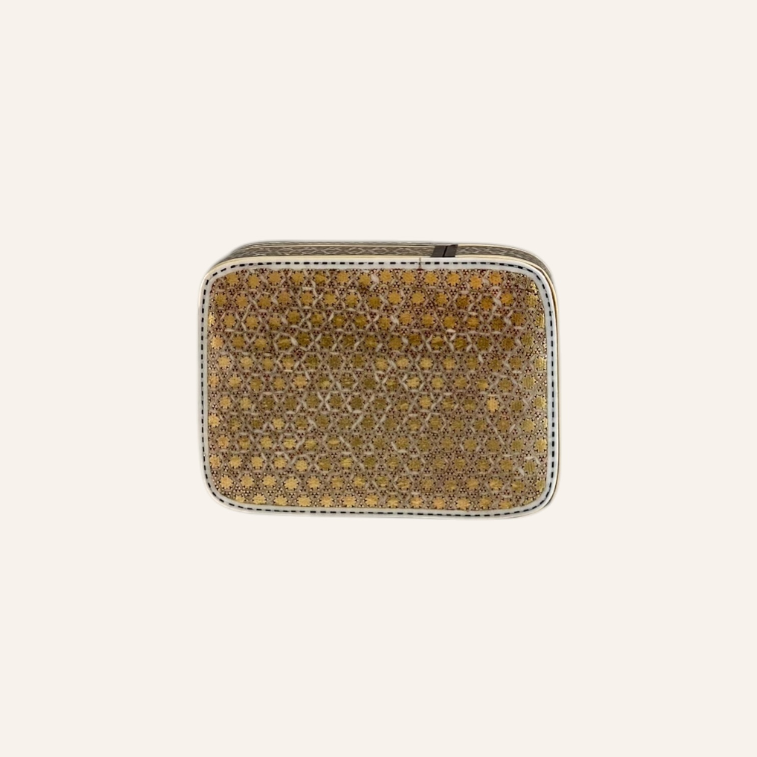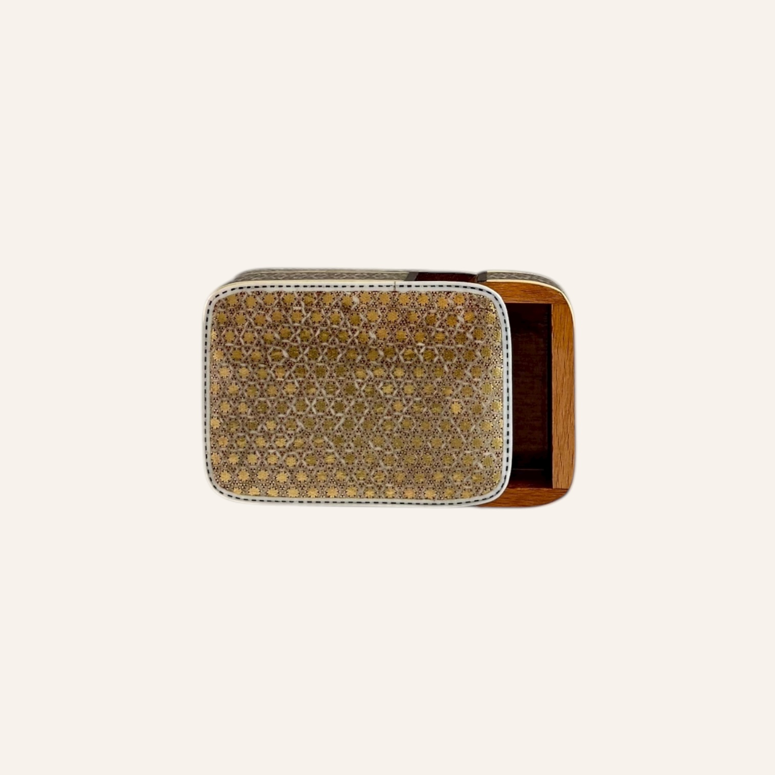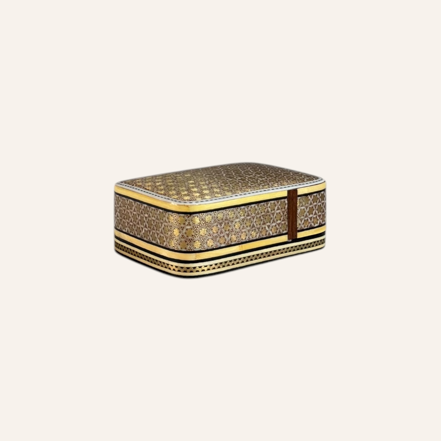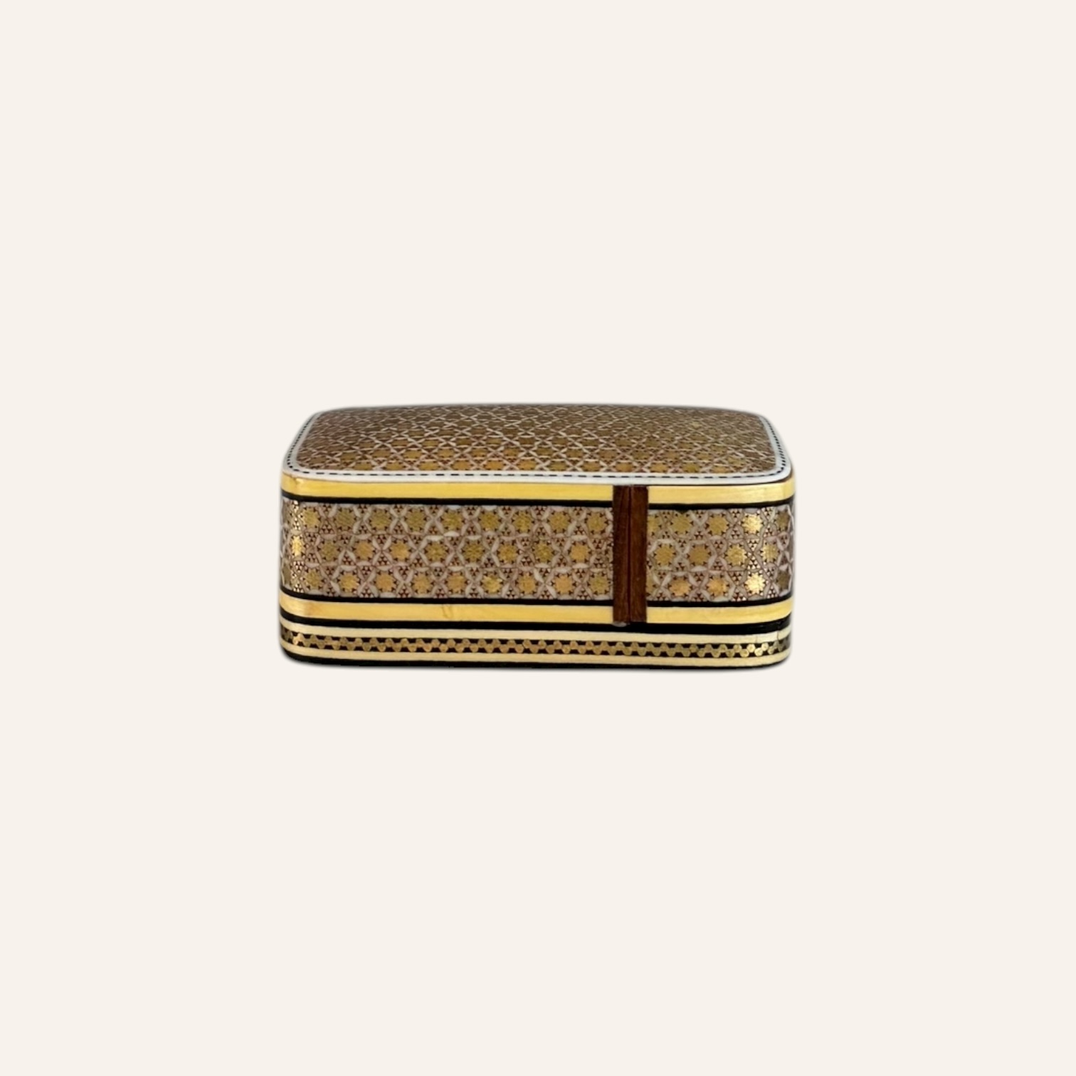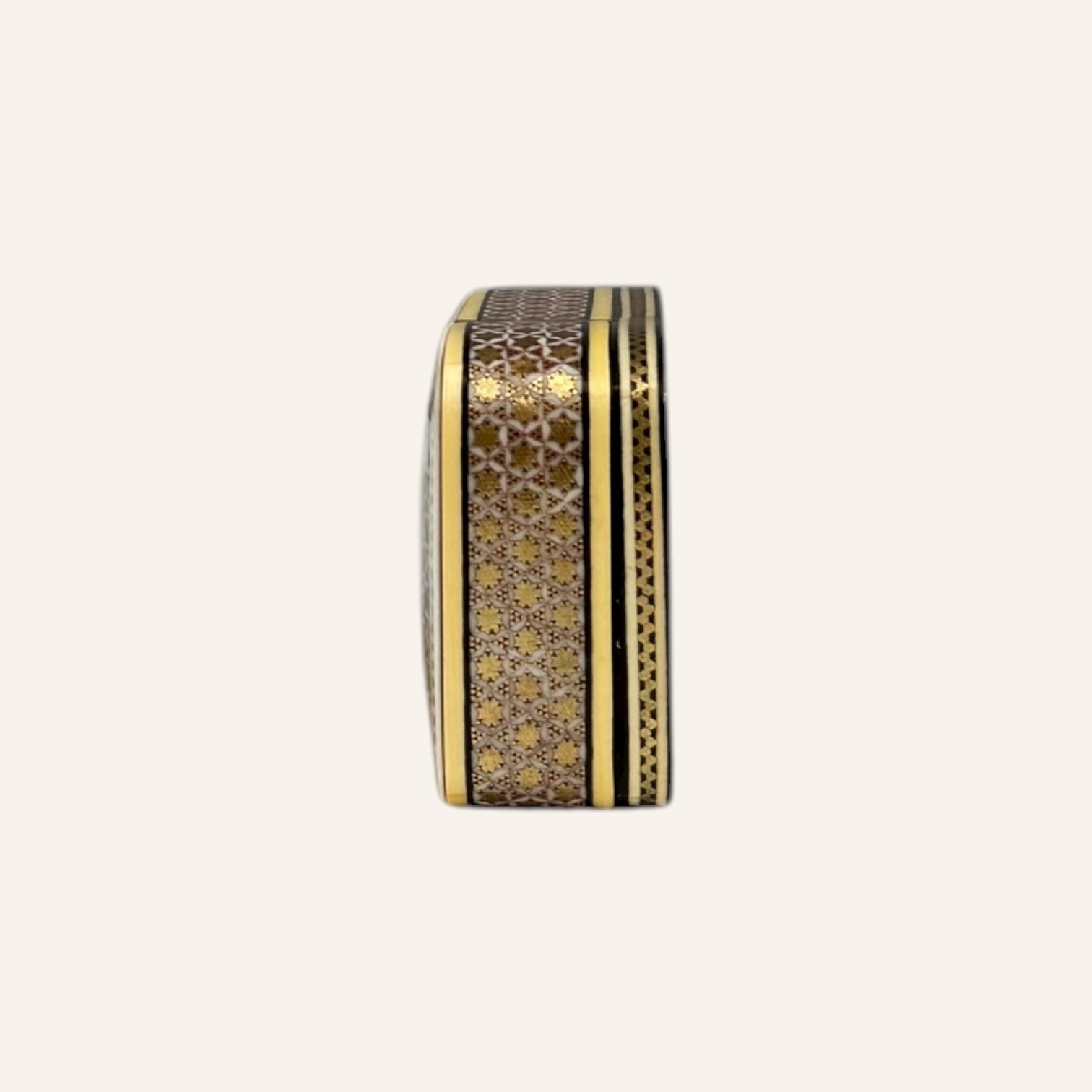 Rooted in the golden age of Persian craftsmanship, Khatam is the delicate art of inlaying fine geometric patterns into wood, brass, and bone — a meticulous technique passed through generations of master artisans. Each piece is composed of hundreds of hand-cut miniatures, arranged with precision to create star-shaped mosaics that reflect harmony, patience, and mathematical beauty.