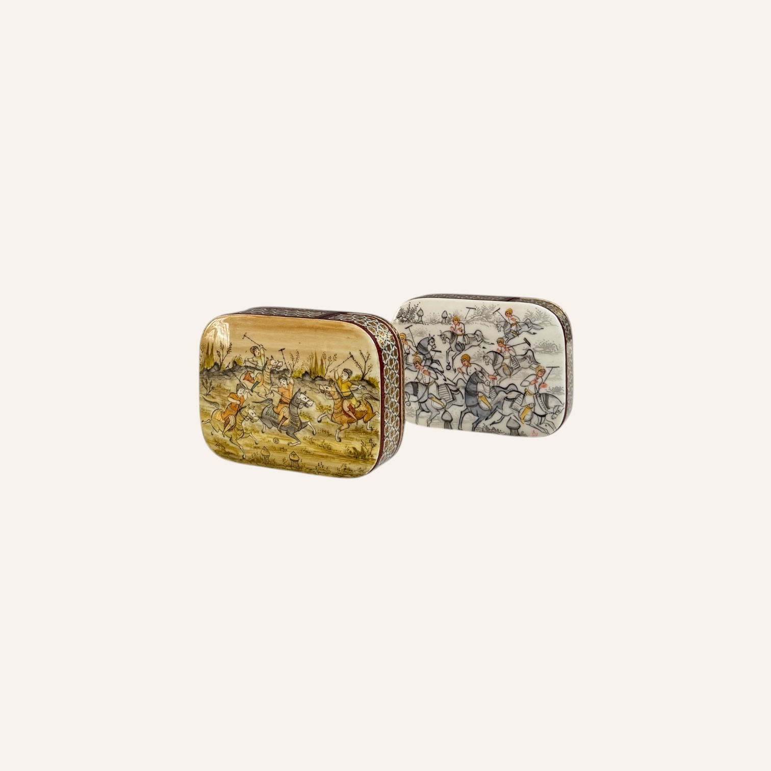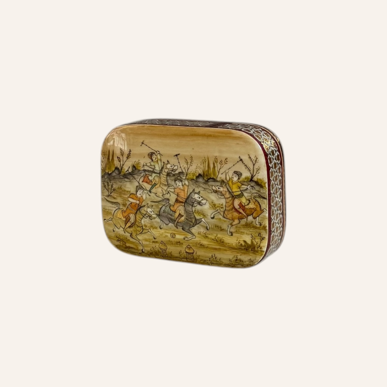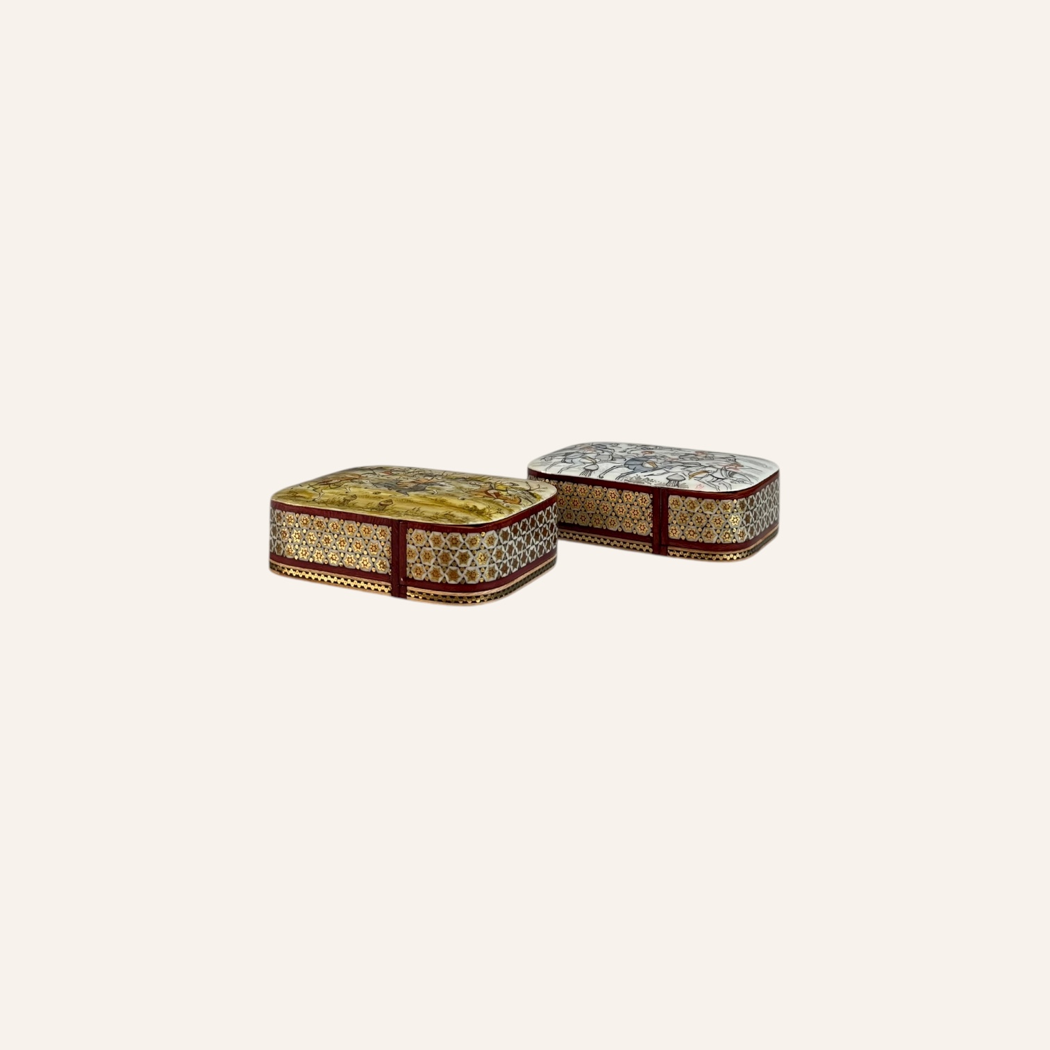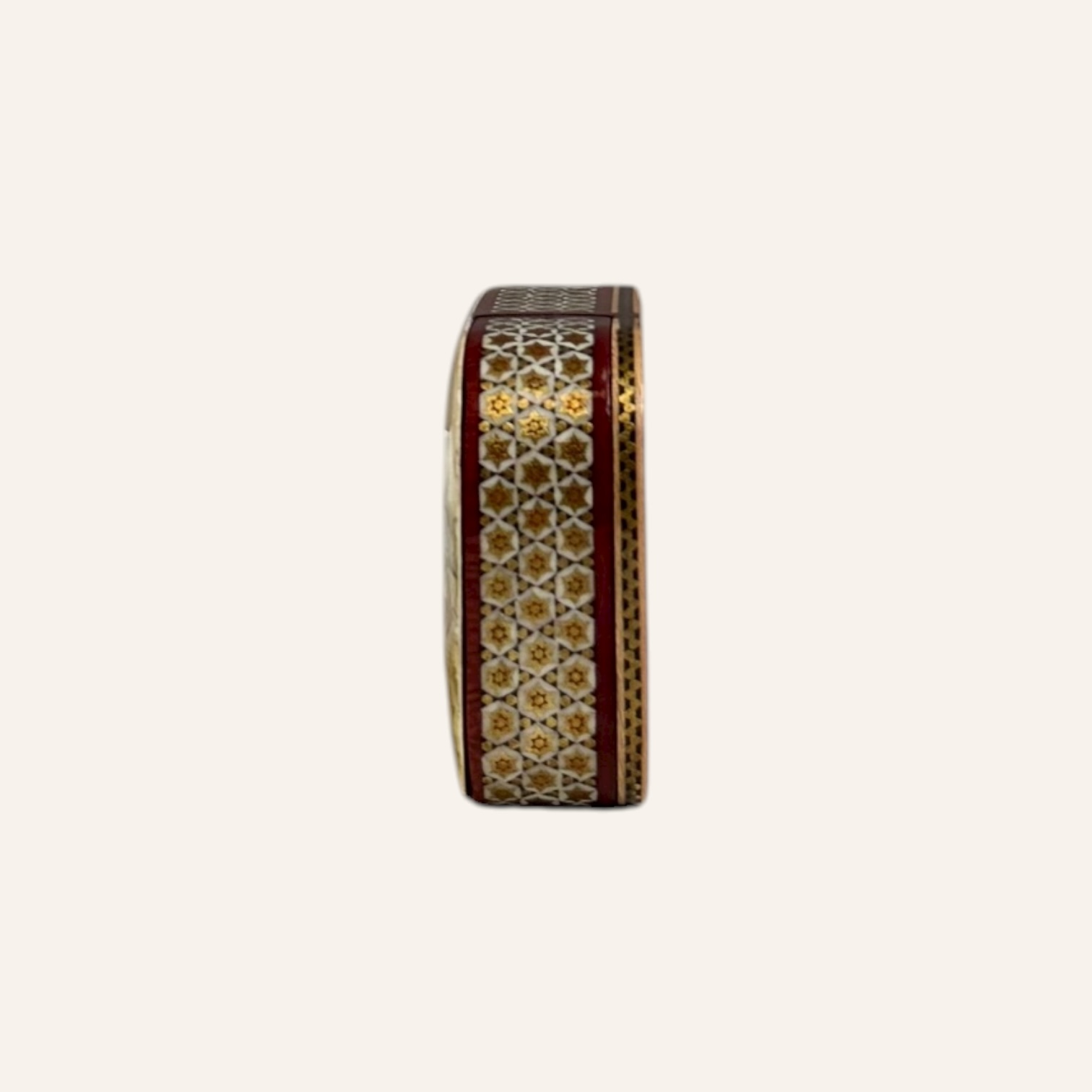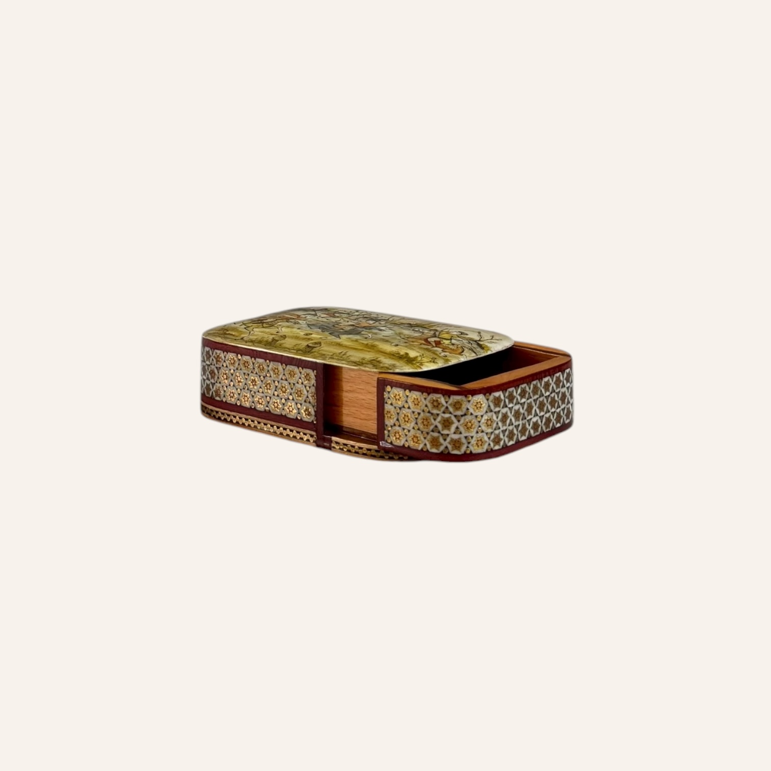 Rooted in the golden age of Persian craftsmanship, Khatam is the delicate art of inlaying fine geometric patterns into wood, brass, and bone — a meticulous technique passed through generations of master artisans. Each piece is composed of hundreds of hand-cut miniatures, arranged with precision to create star-shaped mosaics that reflect harmony, patience, and mathematical beauty.