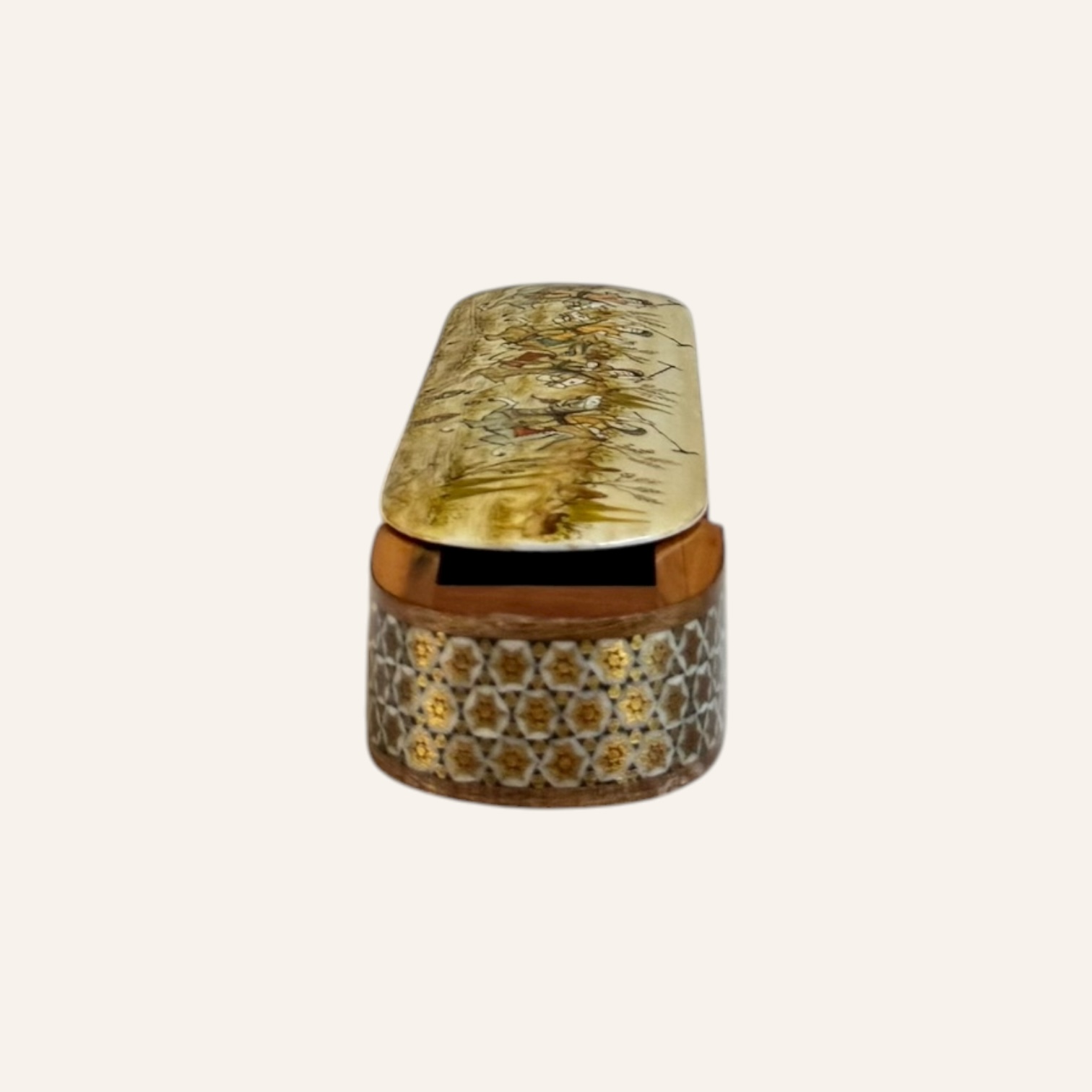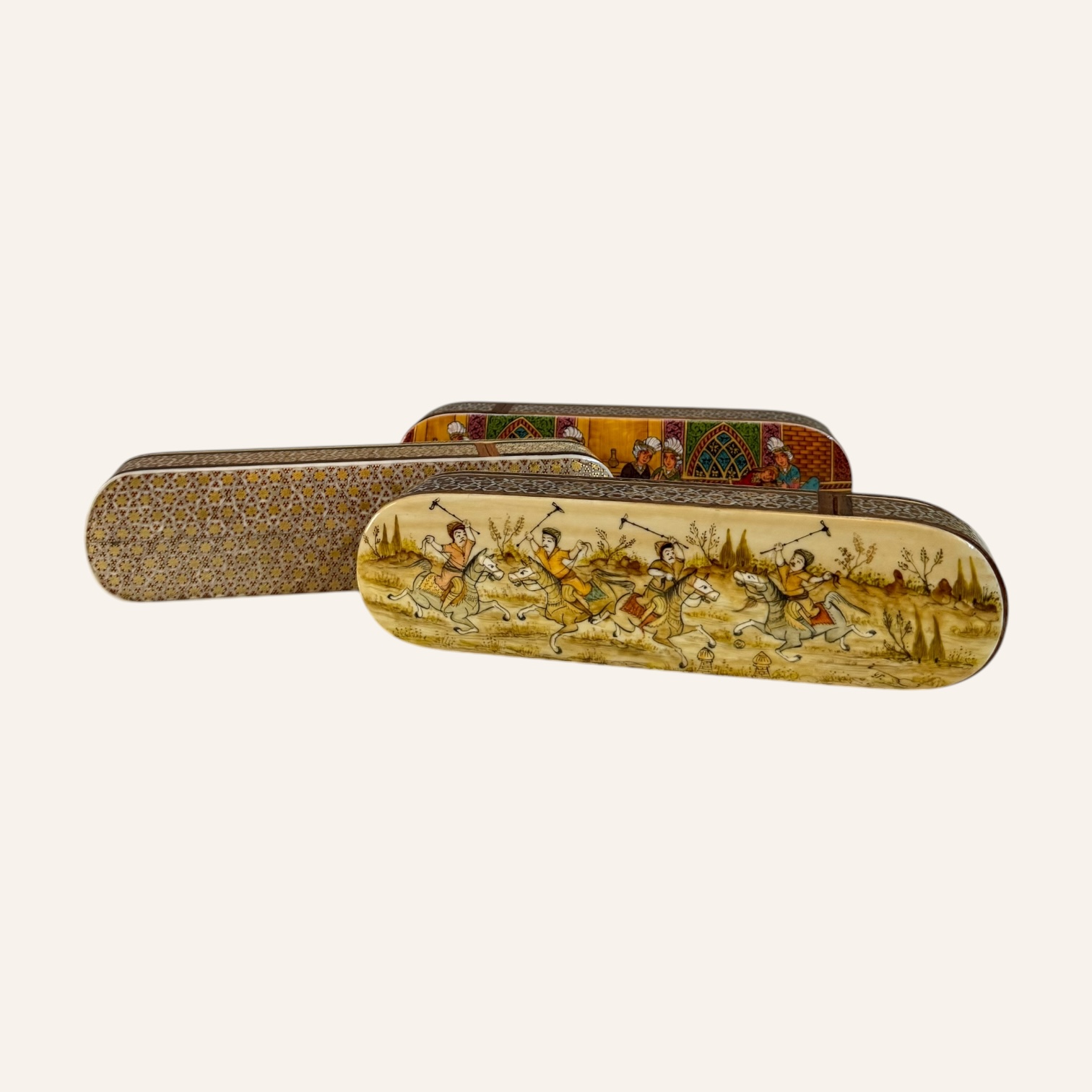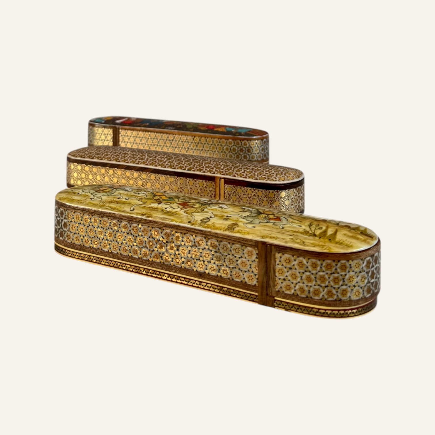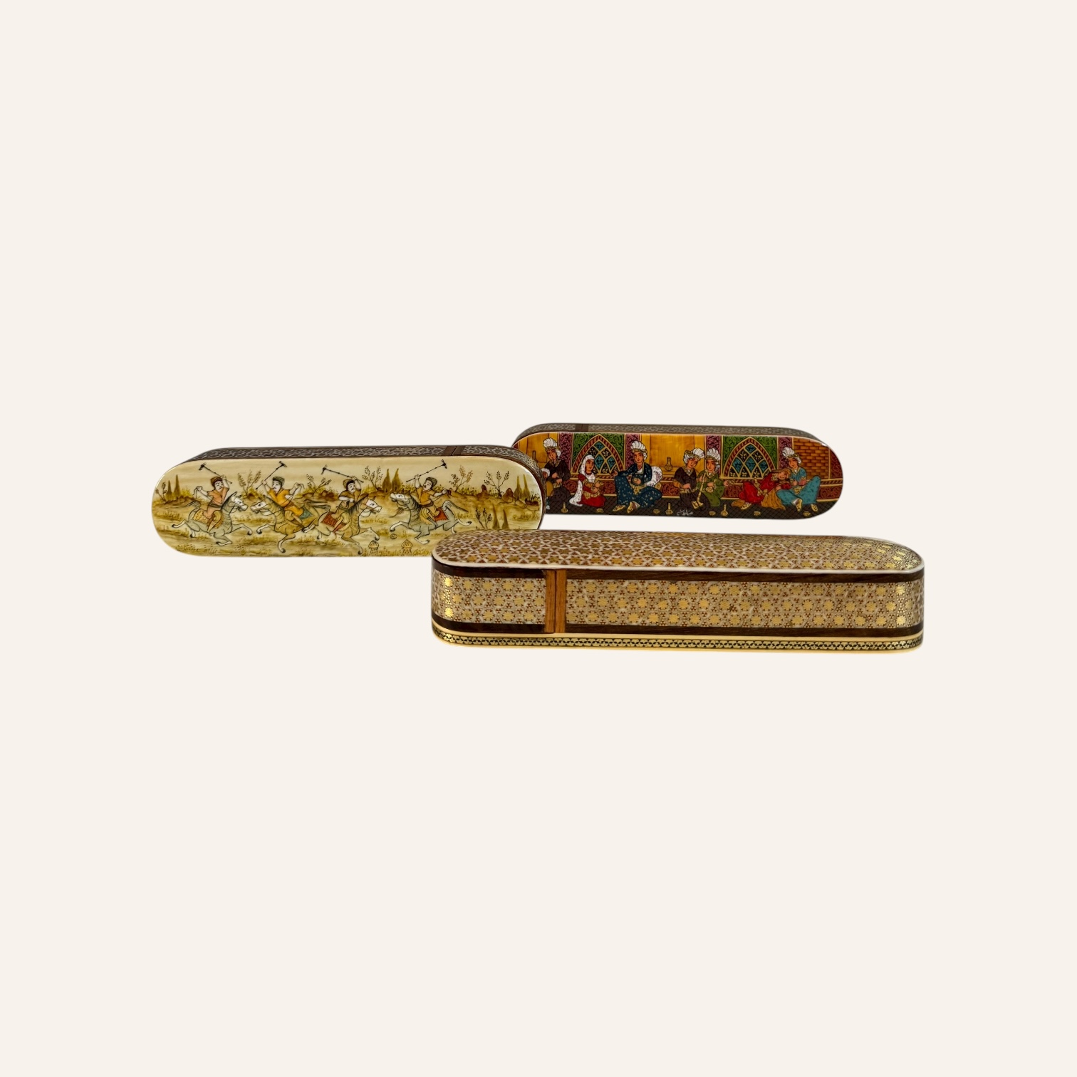 Rooted in the golden age of Persian craftsmanship, Khatam is the delicate art of inlaying fine geometric patterns into wood, brass, and bone — a meticulous technique passed through generations of master artisans. Each piece is composed of hundreds of hand-cut miniatures, arranged with precision to create star-shaped mosaics that reflect harmony, patience, and mathematical beauty.