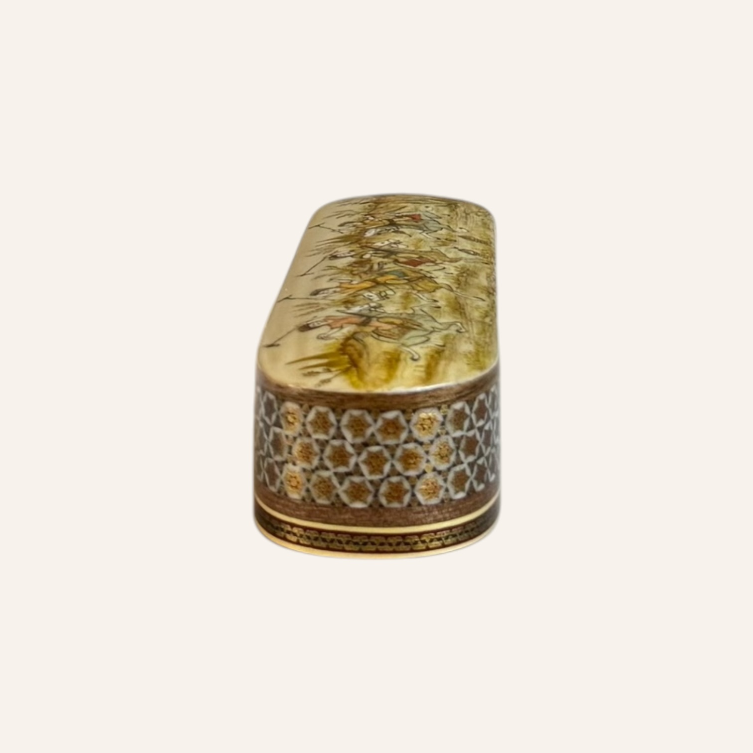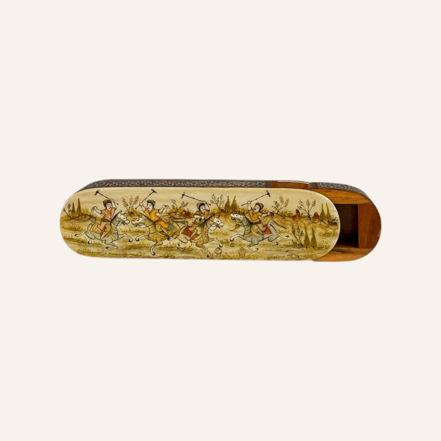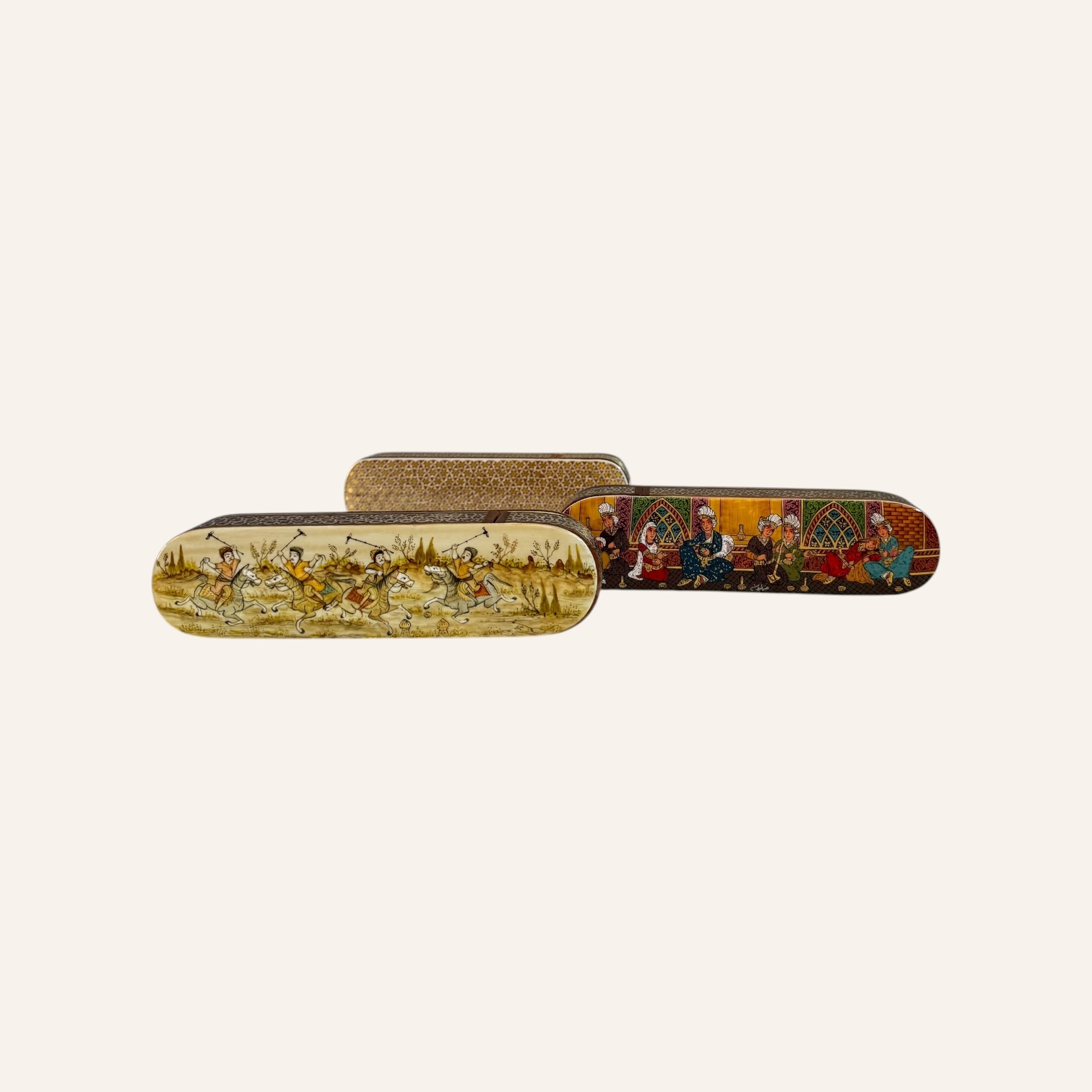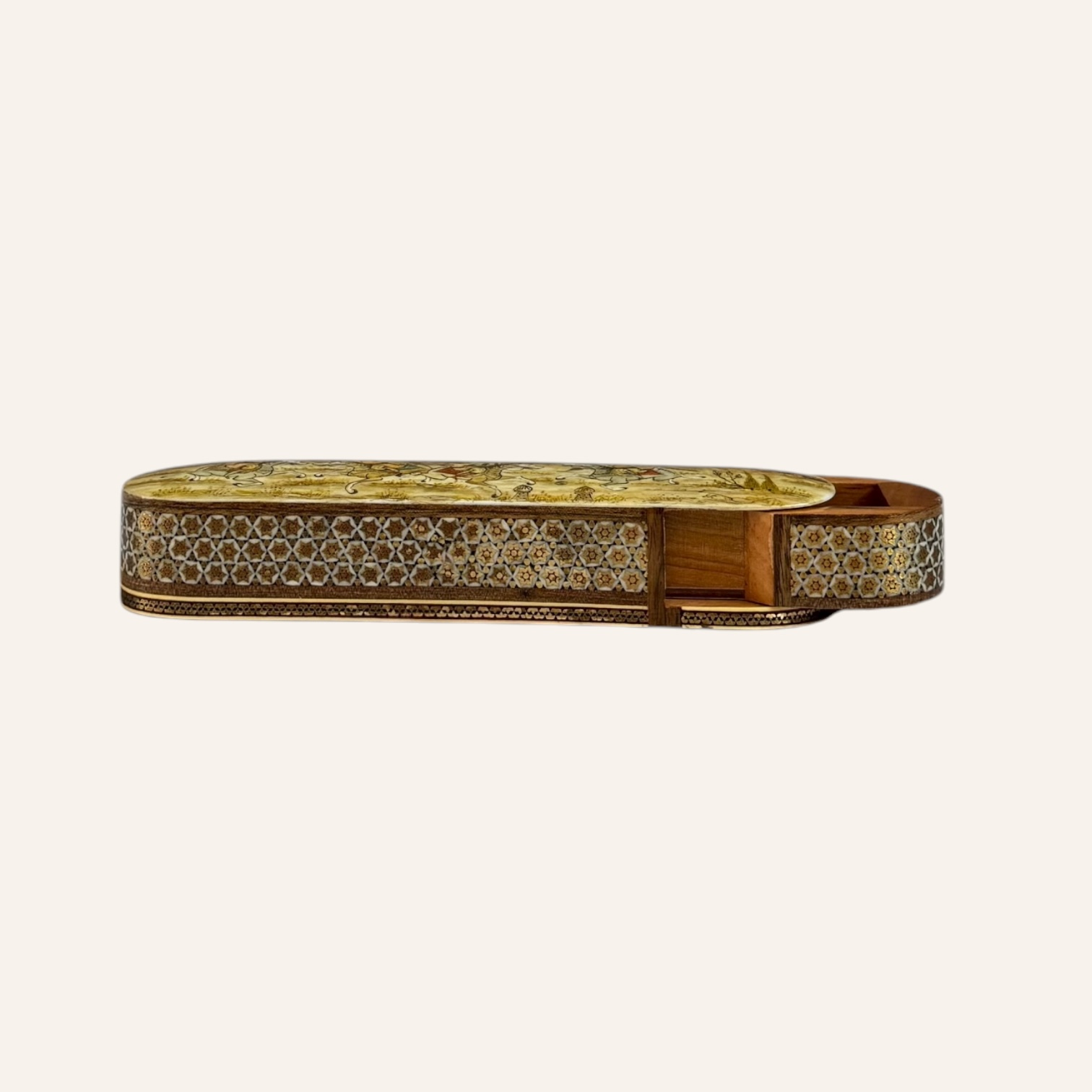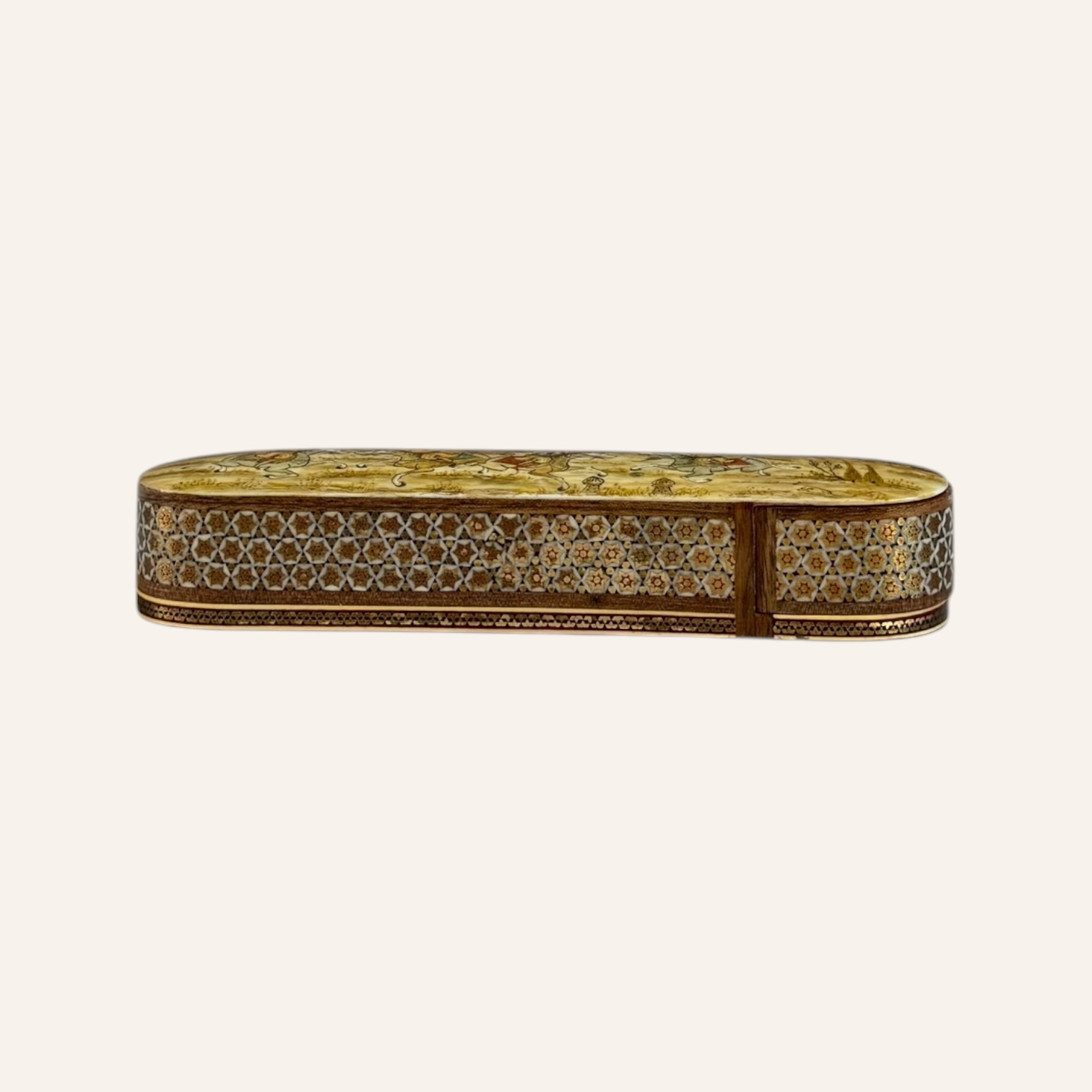 Rooted in the golden age of Persian craftsmanship, Khatam is the delicate art of inlaying fine geometric patterns into wood, brass, and bone — a meticulous technique passed through generations of master artisans. Each piece is composed of hundreds of hand-cut miniatures, arranged with precision to create star-shaped mosaics that reflect harmony, patience, and mathematical beauty.